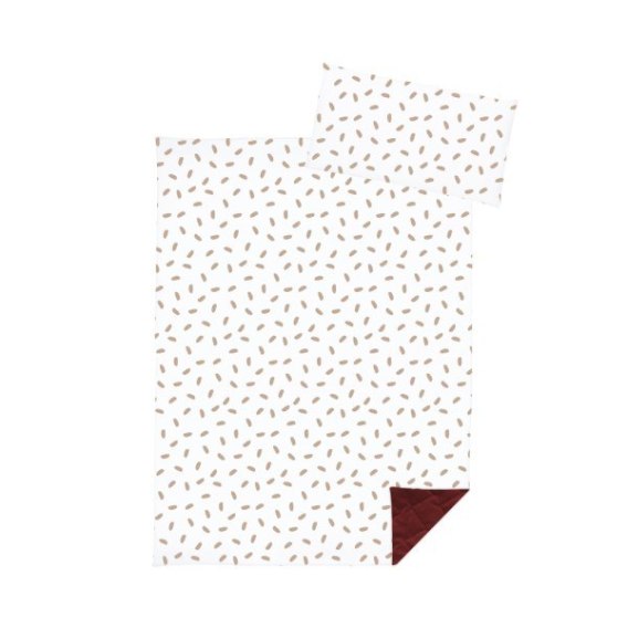 Jest to produkt dwustronny: 1 strona to pikowany velvet - niezwykle miękki i miły w dotyku, 2 - bardzo dobrej jakości jersej z unikatowym wzorem w beżowe cętki wg. projektu własnego Albero Mio. Kocyki wypełnione są puszystą, antyalergiczną włókniną silikonową