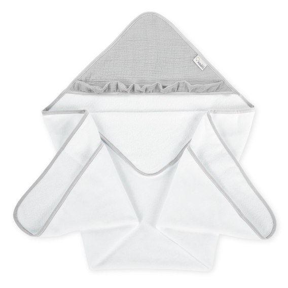Wyjątkowym elementem tego produktu jest kapturek, który wykonany jest z miękkiego muślinu bawełnianego ozdobionego uroczą falbanką. Dzięki temu okrycie kąpielowe zyskuje nie tylko praktyczne zastosowanie, ale również staje się estetycznym dodatkiem. Rozmiar okrycia został tak dobrany, aby dziecko zostało w całości otulone przyjemnym ciepłem. Dodatkowym udogodnieniem jest doszyty do kapturka uchwyt służący powieszeniu.