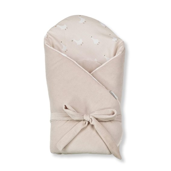 Satyna bawełniana, z której wykonany jest różek, to tkanina naturalna i przyjazna dla skóry dziecka. Posiada wyjątkowy delikatny nadruk beżowego tła z białą Gąską Gają, który dodaje produktowi wyjątkowego charakteru. Druga strona wykonana jest z miękkiego i przyjemnego w dotyku weluru bawełnianego. Rożek ma wszyte antyalergiczne wypełnienie, które w doskonały sposób izoluje ciepło i przepuszcza powietrze. Nie posiada dodatkowego usztywnienia, dzięki czemu zapewnia utrzymanie naturalnej i wygodnej dla noworodka pozycji. Wiązany za pomocą troczków, pozwala na indywidualne dopasowanie rozmiaru rożka do wymiarów i potrzeb niemowlaka.