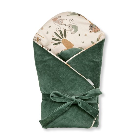 Satyna bawełniana, z której wykonany jest różek, to tkanina naturalna i przyjazna dla skóry dziecka. Posiada nadruk bawiących się zwierzątek pośród tropikalnych drzew, który dodaje produktowi wyjątkowego charakteru. Druga strona wykonana jest z miękkiego i przyjemnego w dotyku weluru bawełnianego. Rożek ma wszyte antyalergiczne wypełnienie, które w doskonały sposób izoluje ciepło i przepuszcza powietrze. Nie posiada dodatkowego usztywnienia, dzięki czemu zapewnia utrzymanie naturalnej i wygodnej dla noworodka pozycji. Wiązany na kokardę, pozwala na indywidualne dopasowanie rozmiaru rożka do wymiarów i potrzeb niemowlaka.