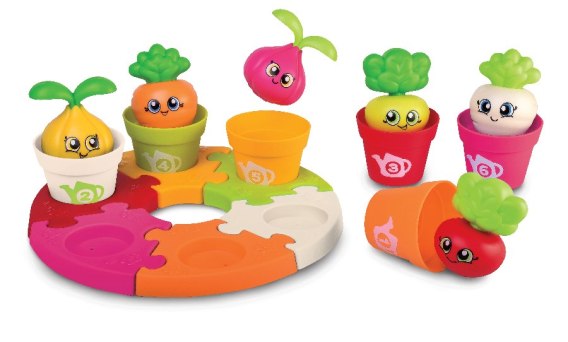 - zestaw zawiera 18 elementów: 6 warzyw, 6 doniczek i 6 puzzli do złożenia tacki;