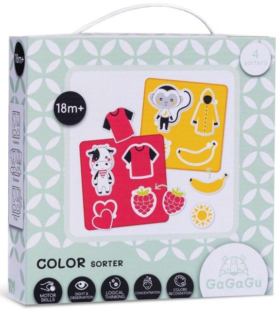 Zestaw zawiera 4 tabliczki o 4 różnych kolorach, każdy o innym poziomie trudności. Dzięki drobnym wcięciom usuwanie poszczególnych elementów jest dużo łatwiejsze. Obrazki przedstawiają zwierzątka GaGaGu oraz to, co najczęściej jedzą. Różne kolory oraz kształty ułatwiają dziecku odnalezienie części do odpowiednich układanek. Puzzle stymulują sprawność manualną, koncentrację i percepcję wzrokową.