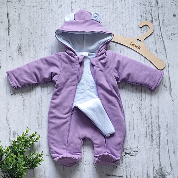 Kombinezon uszyty jest z dwóch warstw bawełny, z zewnątrz wrzosowo-lawendowa bawełna, od wewnątrz bawełna w kolorze białym. Kaptur z zabawnymi uszkami obszyty jest od wewnątrz bawełnianą podszewką.