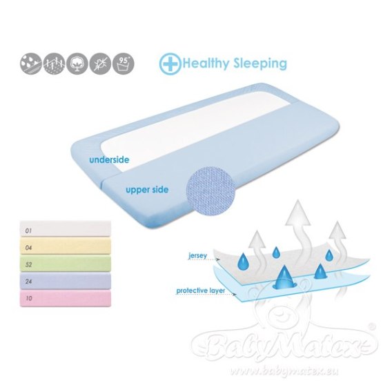 Wierzchnia warstwa wykonana jest z miękkiego jerseyu zapobiegającego podrażnieniom sktóry, natomiast spodnia warstwa prześcieradła, wykonana jest z oddychającej membrany poliuretanowej. Nie przepuszcza płynów, chroniąc materac przed zmoczeniem. Posiada wszytą gumę, która uniemożliwia przesunięcie się prześcieradełka. Dostępne w dwóch rozmiarach.