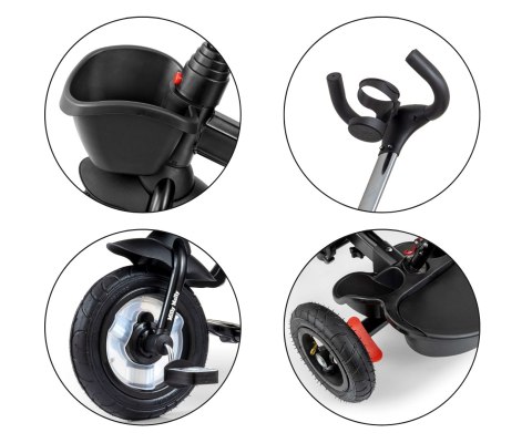 MOVI jest stabilny i bezpieczny, posiada nowoczesną konstrukcję, wygodne wyprofilowane obracane o 360 stopni siedzisko, które umożliwi podróż przodem lub tyłem do kierunku jazdy. Rowerek został wyposażony w barierkę zabezpieczająca dziecko przed wypadnięciem, trzypunktowe pasy bezpieczeństwa oraz podnóżki a pompowane koła umożliwiają cichą i komfortową jazdę. Po zdemontowaniu rączki, barierek, budki i pokrowca na siedzisko MOVI będzie służył jako rowerek trójkołowy. Dzięki funkcji „wolnego koła" dziecko może swobodnie pedałować, a kierownica dla rodzica nadal może korygować prędkość przemieszczania.