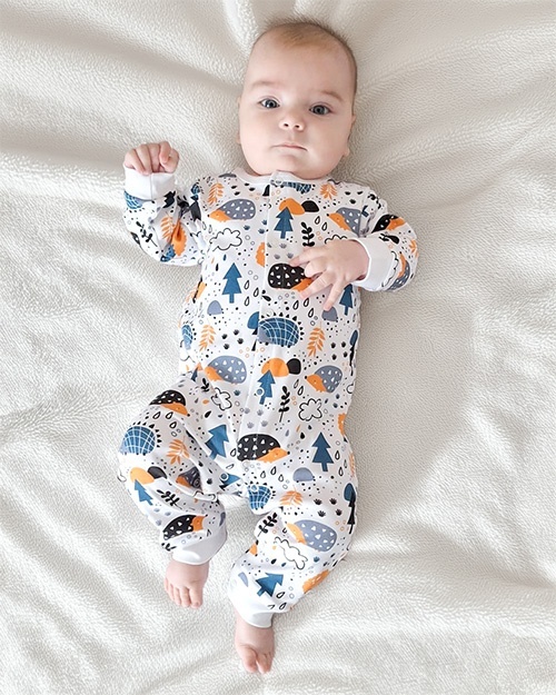 Pajacyk szyty jest w wersji z zakrytymi stópkami w rozmiarach 56-62, a w rozmiarach 68-86 na dole nogawek są ściągacze. Dzięki temu kilkumiesięczne dziecko może eksplorować swoje nóżki i bez przeszkód uczyć się pełzania i czworakowania.