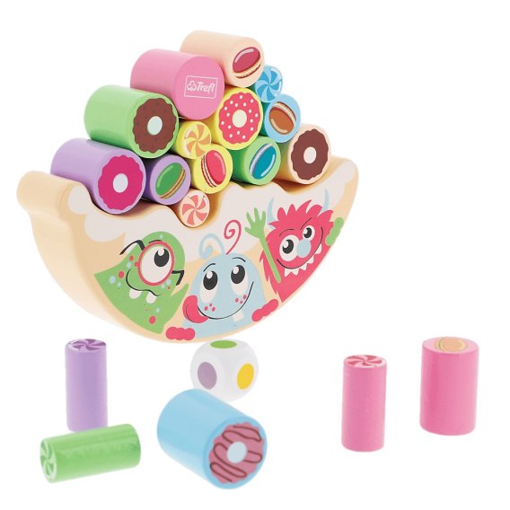 Łakocie w Locie to zabawka wykonana z wysokiej jakości naturalnego drewna. Zabawa polega na ułożeniu nad głowami ciasteczkowych potworków jak największej ilości łakoci przy jednoczesnym zachowaniu równowagi całej konstrukcji. Znakomite rozwiązanie dla dzieci od 3 roku życia, które dzięki zabawce poznają pojęcie równowagi oraz nauczą się cierpliwości Łakocie w locie pobudzają wyobraźnię, uczy koncentracji i wzmacniają relacje.
