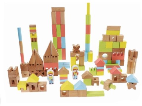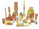 Drewniane klocki wspierają rozwój kreatywności, a figurki zachęcają do odgrywania ról i wspierają rozwój wyobraźni