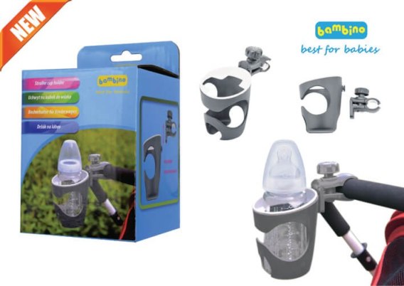 Pasuje do większości kubków i butelek. Łatwe mocowanie do większości wózków. Uchwyt utrzymuje napoje w pozycji pionowej i zapobiega rozlaniu.