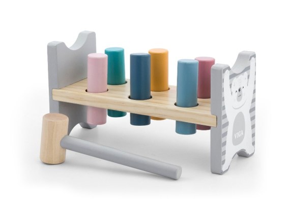Kolorowy przebijak od firmy Viga to zabawka którą pokocha każde dziecko. Delikatne pastelowe kolory oraz wygodny w uchwyceniu młotek zachęcą każdego malucha do zabawy. Przy okazji zabawka poprawi koordynację wzrokowo-ruchową jak i pomoże ćwiczyć sprawność rączek oraz rozwija wyobraźnię i uczy kreatywnego myślenia. Zadaniem dziecka jest wbić wszystkie kołki w otwory, aby przeszły na drugą stronę ramy. Czynność można powtarzać poprzez obracanie zabawki.