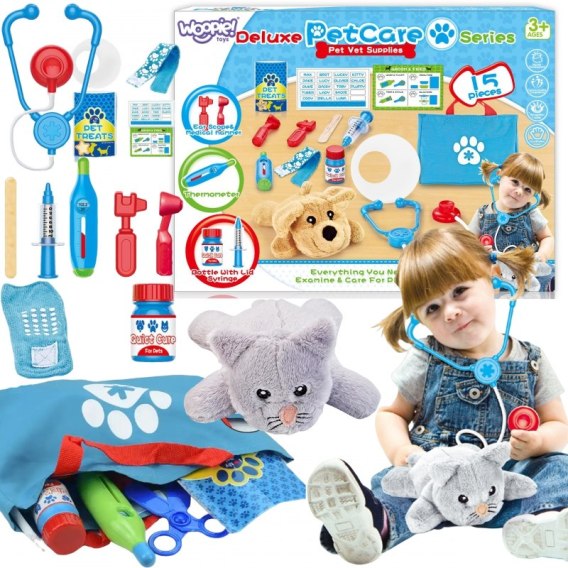 Zestaw Małego Weterynarza od marki WOOPIE to idealna propozycja dla wszystkich miłośników zwierzęta i zabawy w weterynarza. Zestaw zawiera 15 el., w tym: pluszaka/kotka, stetoskop, leki, strzykawkę, kołnierz i wiele innych. Zestaw pozwoli wyleczyć ulubionego zwierzaka, a przy tym dziecko będzie uczyło się empatii i nabywało umiejętności społecznych. Opieka nad zwierzętami to także nauka odpowiedzialności. Dziecko będzie mogło zabrać i bawić się swoim pupilem wszędzie, dzięki przenośnej torbie z wygodną rączką. Zabawka w weterynarza - odgrywanie ról - pozytywnie wpływa na rozwój dziecka, pobudza wyobraźnie oraz kreatywność.