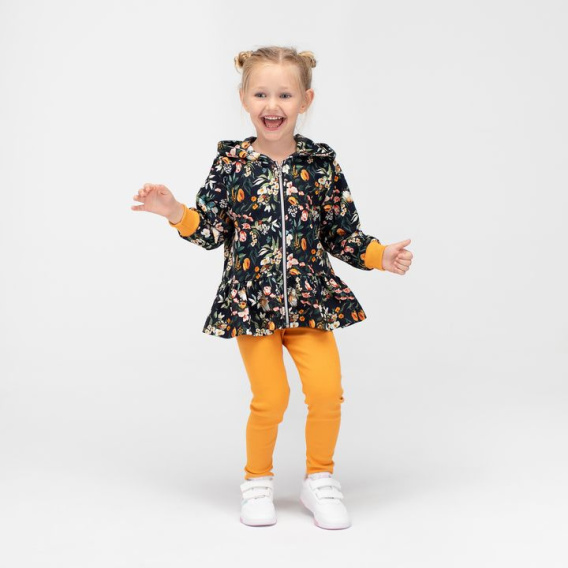Ten komplet dla dziewczynki to piękna jesienna propozycja od polskiej marki KLAWO. Kaptur wykończony jest w środku tym samym materiałem, co wierzch kombinezonu, dzięki czemu prezentuje się przepięknie. Całość podkreślona została ciemnomiodowym świągaczem. Materiał to bawełna z domieszką elastanu, dzięki czemu jest bardzo elastyczny i wygodny, łatwo założyć go na inne ubrania.